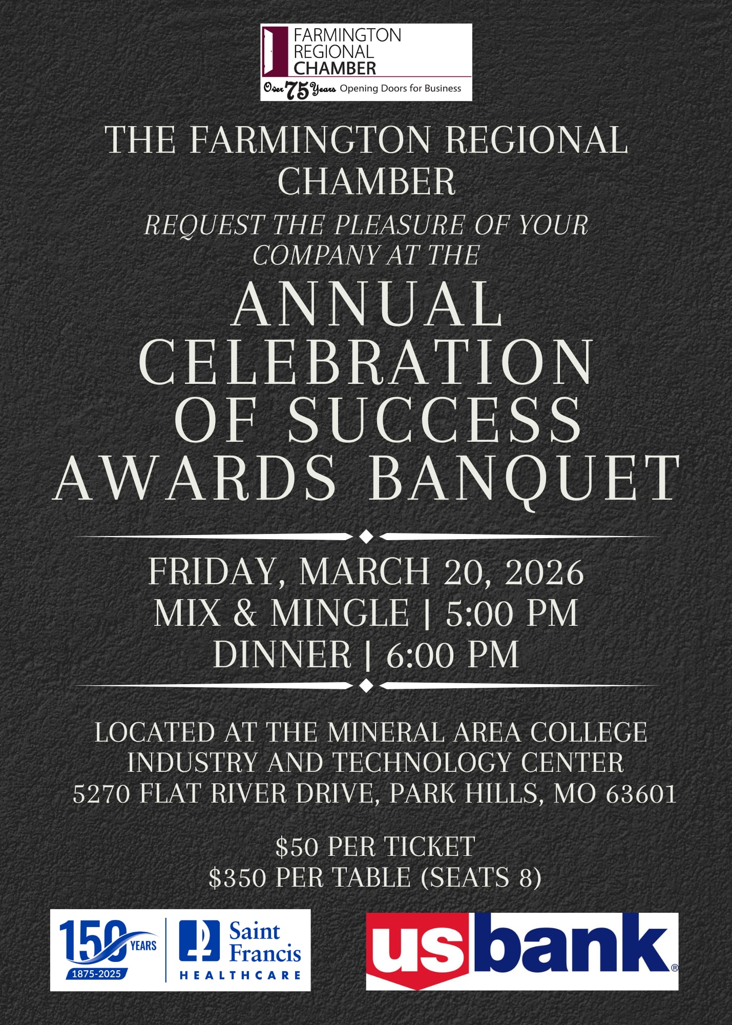 The Annual Celebration of Success Awards Banquet will be held on March 20th at Mineral Area College in the Industry and Technology Building.