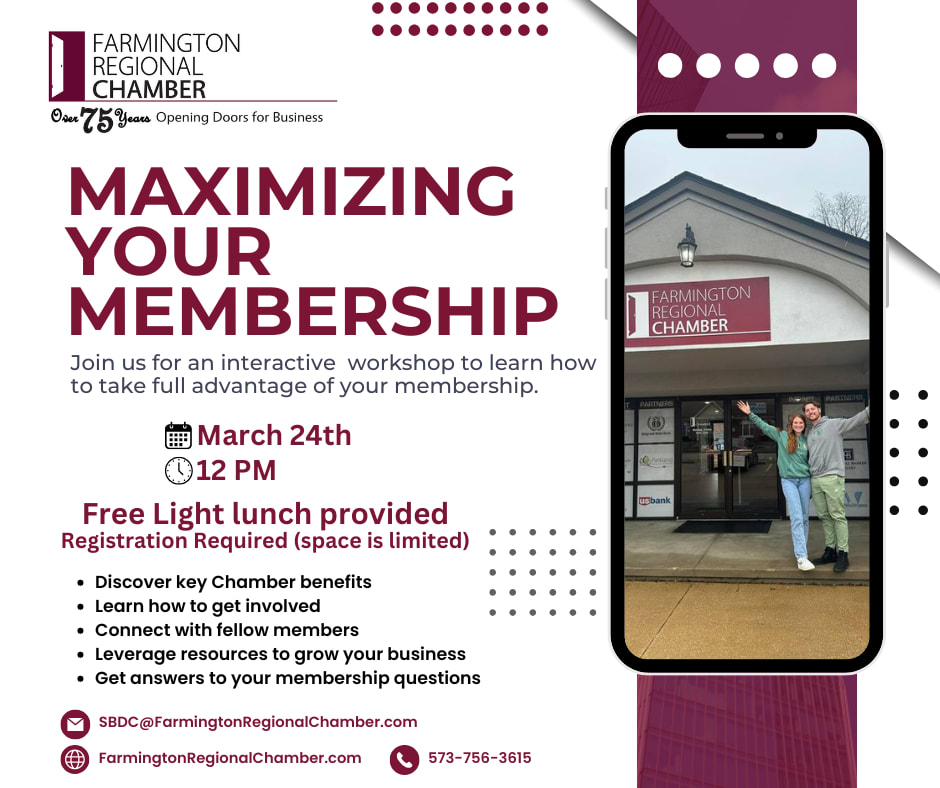 Join us for an interactive workshop to learn how to take full advantage of your membership. Free Light lunch provided Registration Required (space is limited) Discover key Chamber benefits Learn how to get involved Connect with fellow members Leverage resources to grow your business Get answers to your membership questions.
