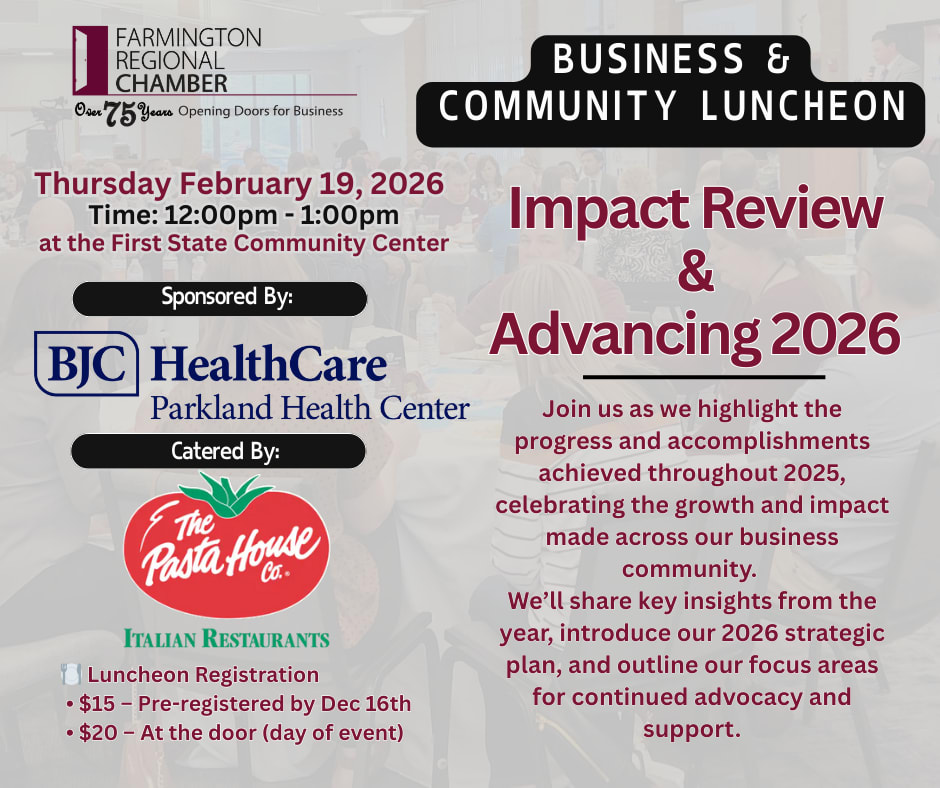 Join us for a networking luncheon sponsored. A delicious lunch is available for $15 per person. Out of respect for our caterer, reservations are REQUIRED by the Tuesday prior to the luncheon. Payment will be accepted at the door. Cancellations must be received by the Tuesday prior to the luncheon in order to receive a refund otherwise; payment will be expected. Mark your calendar now and plan to join us on the 3rd Thursday of every month to learn more about our region and business issues, and network with fellow Farmington Chamber members.