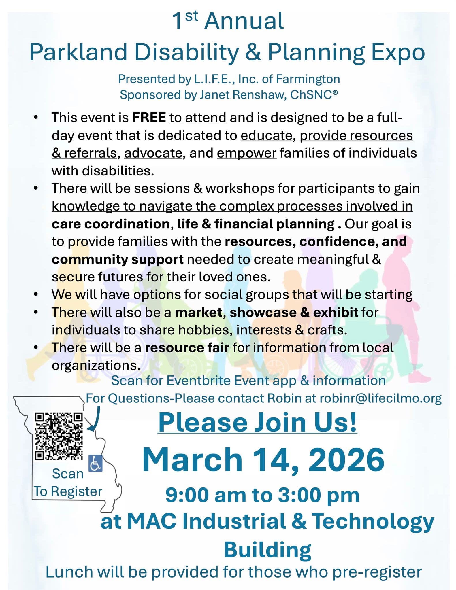 1st Annual Parkland Disability & Planning Expo is a free community event to provide and share information and resources to parents and/or guardians who care for individuals with special needs. We will have key note speaker, and Q & A panel for planning, breakout sessions for more specific discussion, planning and guidance, and a resource fair for regional organizations, small group sign up for social and support groups, demonstrations throughout the day, and a Market, Showcase and Exhibit for individuals to have a safe place to share their interests, hobbies, crafts, and passions. This event is free for ALL! Attendees and vendor organizations and exhibitiors must register. (Vendor Organizations - in lieu of booth fee, we ask that you please bring a giveaway for attendance prizes that will be drawn throughout the day) All who register will be provided a free lunch. Register here: 1st Annual Parkland Disability & Planning Expo Tickets, Saturday, Mar 14 from 9 am to 4 pm | Eventbrite