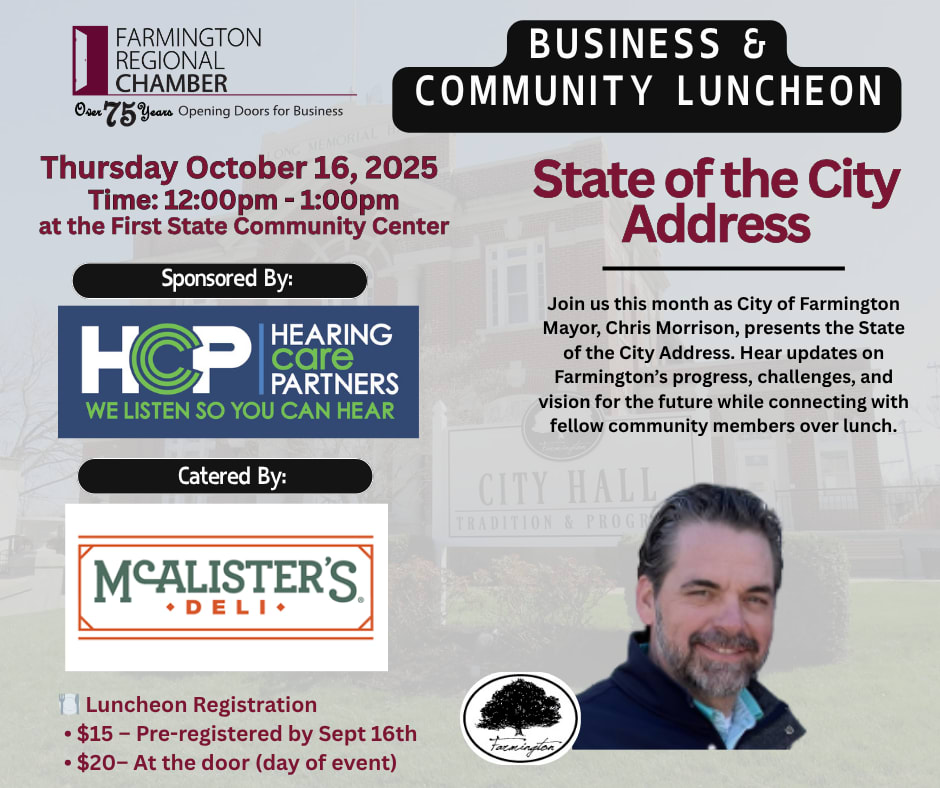 Join us for a networking luncheon sponsored. A delicious lunch is available for $15 per person. Out of respect for our caterer, reservations are REQUIRED by the Tuesday prior to the luncheon. Payment will be accepted at the door. Cancellations must be received by the Tuesday prior to the luncheon in order to receive a refund otherwise; payment will be expected. Mark your calendar now and plan to join us on the 3rd Thursday of every month to learn more about our region and business issues, and network with fellow Farmington Chamber members.
