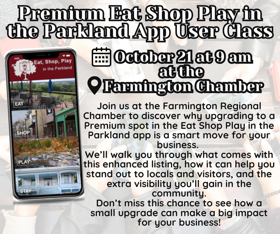 Join us at the Farmington Regional Chamber to discover why upgrading to a Premium spot in the Eat Shop Play in the Parkland App is a smart move for your business. We’ll walk you through the best use cases, show you how to preschedule notifications with graphics, explain how it can help you stand out to locals and visitors, and highlight the extra visibility you’ll gain in the community.