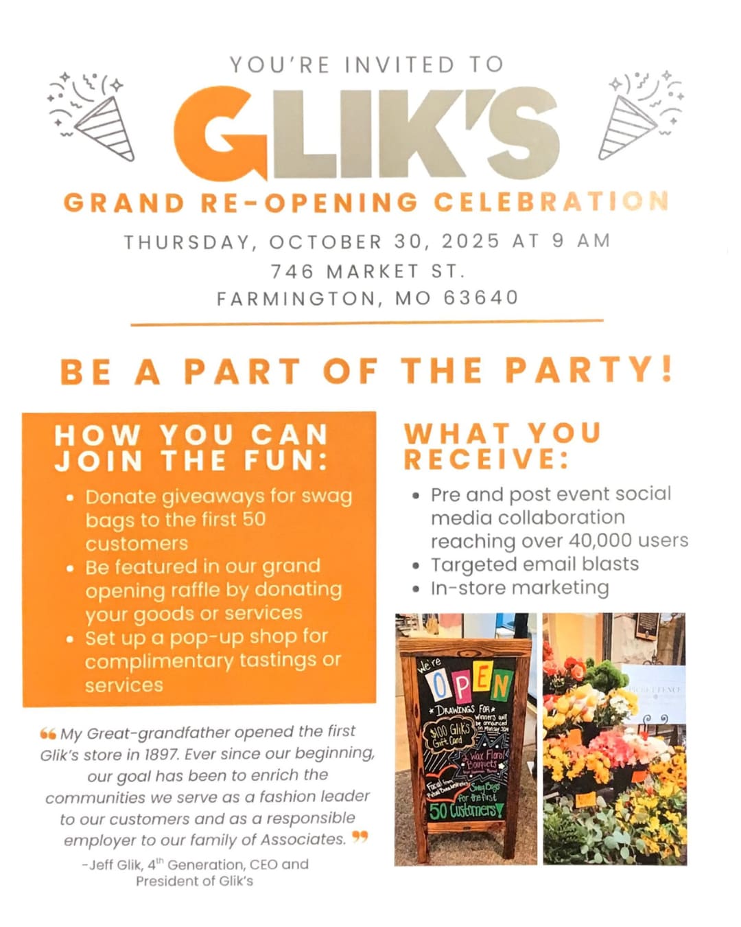 Glik’s is inviting the community to celebrate their Grand Re-Opening on Thursday, October 30, 2025, at 9 a.m. The event will take place at their Farmington location, 746 Market Street. Local businesses and organizations are encouraged to join the fun by donating giveaways for swag bags for the first 50 customers, contributing goods or services for the grand opening raffle, or setting up a pop-up shop to offer complimentary tastings or services. Participants in the celebration will benefit from pre- and post-event social media promotion reaching over 40,000 users, targeted email marketing, and in-store exposure. As Glik’s fourth-generation CEO Jeff Glik shared, the company has been dedicated to enriching the communities it serves since the first store opened in 1897, continuing to be both a fashion leader for customers and a responsible employer for its associates.Images