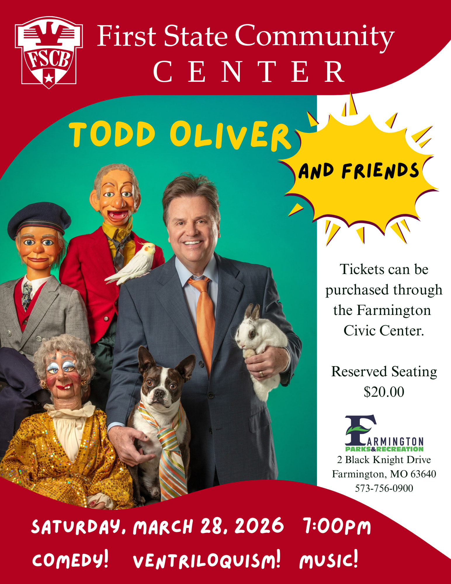 Comedian and America's Got Talent Top Four Finalists, Todd Oliver and his troop of talented animals will be making a stop at the First State Community Center this March. For more information, please call the Farmington Civic Center at 573-756-0900.