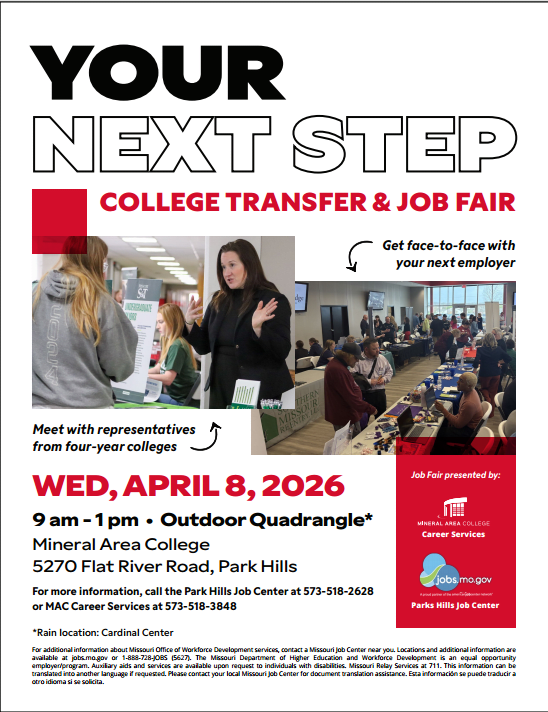 Looking to hire? Reserve a booth at Mineral Area College’s upcoming Job Fair! Connect with local job seekers, share information about your business, and network with other area employers. The event will be held at the Outdoor Quadrangle. **In the event of inclement weather, the event will be moved to The Cardinal Center**