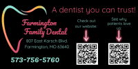 Dental Services Dental Services {Directory Results} Search Radius... 1 mi 5 mi 10 mi 50 mi 100 mi Dental Services Results: 5 Farmington Family Dental 807 E Karsch Blvd, Farmington, MO 63640 (573) 756-5760 Visit Website More Details Karsch Family Dental 214 W. Karsch Blvd., Farmington, MO 63640 (573) 218-9696 Visit Website More Details Schlosser Orthodontics LLC Schlosser Orthodontics LLC 603 Maple Street, Farmington, MO 63640 (573) 482-1061 Visit Website More Details Show Me Dental 812 Valley Creek Drive, Farmington, MO 63640 (573) 756-1236 Visit Website More Details Strange Family Dental, LLC Strange Family Dental, LLC 109 S. Franklin St, Farmington, MO 63640 (573) 756-6415 Visit Website More Details Powered By GrowthZone
