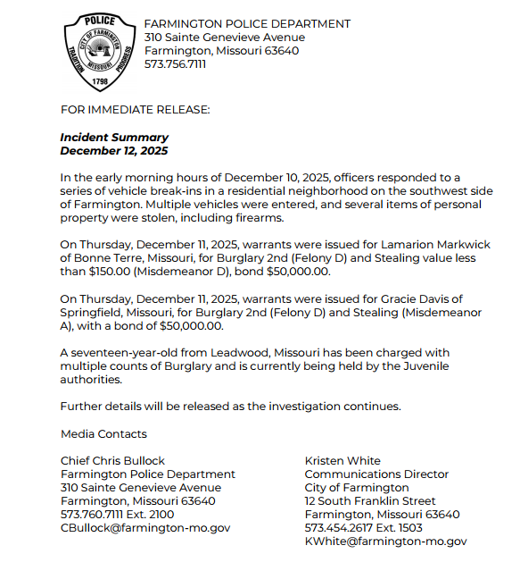 On Thursday, December 11, 2025, warrants were issued for Lamarion Markwick